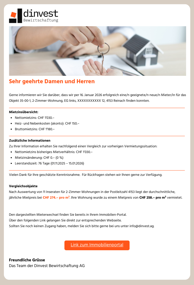 - Leerstands-/Kündigungs-Benachrichtigungen: Eigentümer erhalten neu sofort eine Benachrichtigung, wenn ein Mieter kündigt und wenn ein neuer Vertrag unterzeichnet ist – inkl. Kerndaten wie neuer Mietzins, Vergleich zur vorherigen Vermietung, Leerstandsdauer und Markt-Benchmarks. – 👉 Klicken Sie hier, um eine Beispiel-E-Mail zu sehen