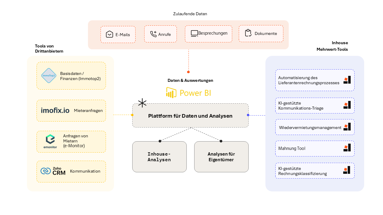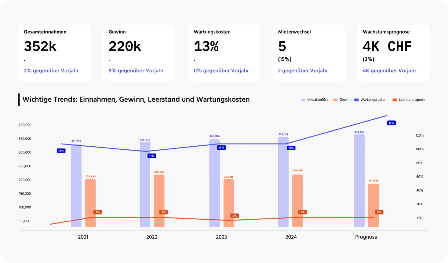 Diese Daten bilden die Grundlage für unser zukünftiges, eigenes Eigentümerportal. Anstelle statischer PDFs bieten wir Zugang zu dynamischen Auswertungen, die vertiefte Analysen zentraler KPIs ermöglichen — darunter Mietpreisentwicklungen, Leerstandsanalyse, Nebenkosten, Instandhaltungs- und Wartungskennzahlen sowie mehrjährige Erfolgsrechnungen. Ergänzt werden diese Auswertungen durch operative Insights sowie Vergleiche mit Vorperioden und relevanten Branchenbenchmarks.
